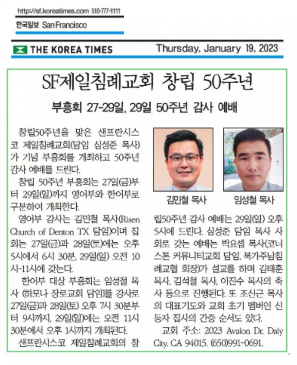 SF제일침례교회 창립 50주년 부흥회27-29일