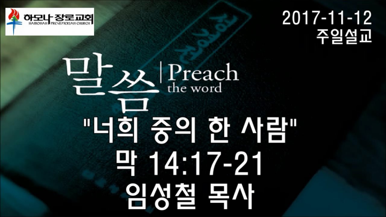 2017-11-12, 너희 중의 한 사람, 막 14:17-21, 주일설교, 하모나장로교회, 임성철 목사