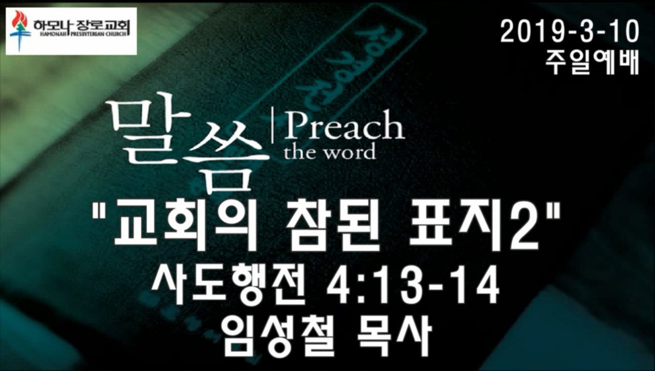 2019-3-10, "교회의 참된 표지2", 사도행전 4:13-14, 주일예배, 하모나장로교회, 임성철 목사