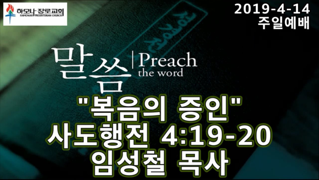 2019-4-14, "복음의 증인", 사도행전 4:19-20, 주일예배, 하모나장로교회, 임성철 목사