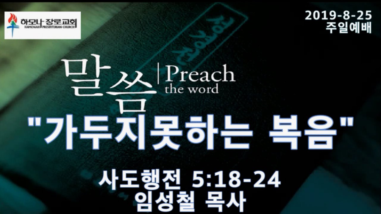 2019-8-25, "가두지못하는 복음", 사도행전5:18-24, 주일예배, 하모나장로교회, 임성철 목사