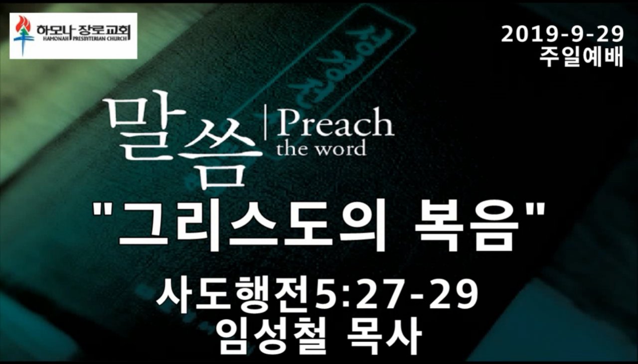 2019-9-29, "그리스도의 복음", 사도행전5:27-29, 주일예배, 하모나장로교회, 임성철 목사