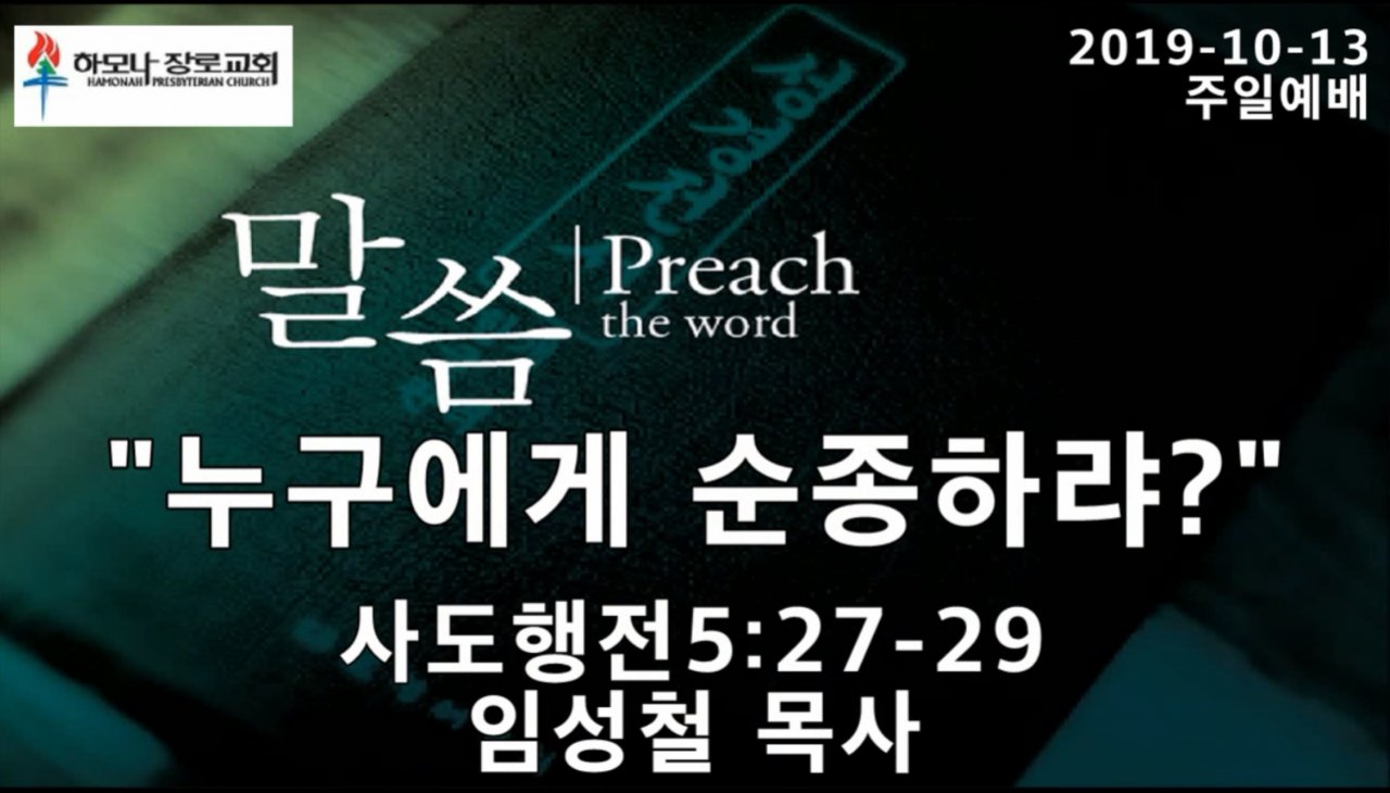 2019-10-13, "누구에게 순종하랴?", 사도행전5:27-29, 주일예배, 하모나장로교회, 임성철 목사