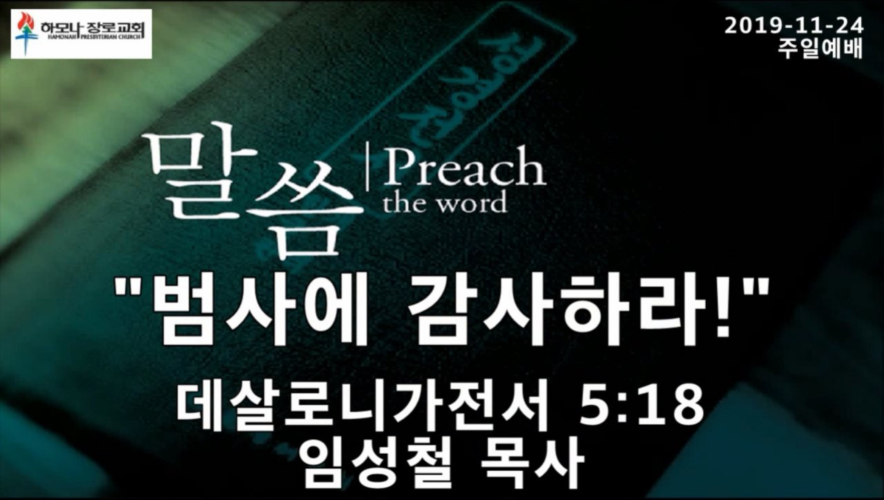 2019-11-24, "범사에 감사하라!", 데살로니가전서 5:18, 주일예배, 하모나장로교회, 임성철 목사