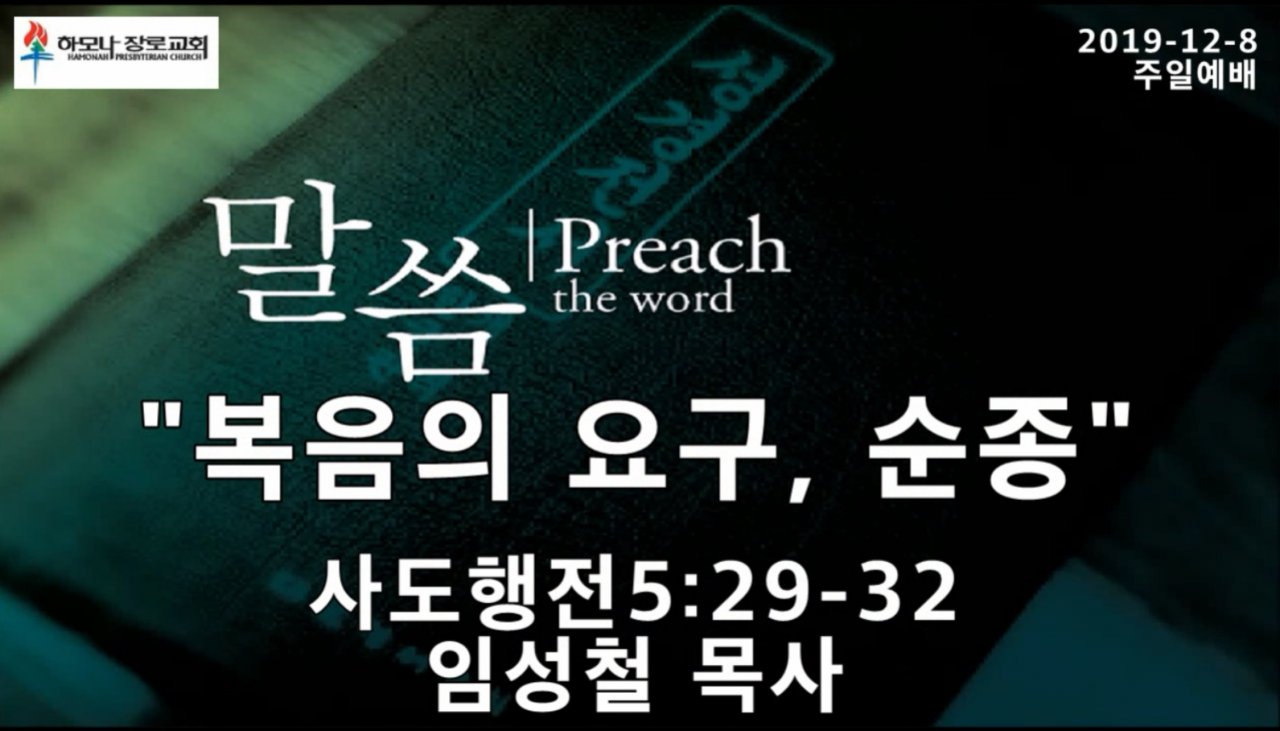 2019-12-8, "복음의 요구, 순종", 사도행전5:29-32, 주일예배, 하모나장로교회, 임성철 목사