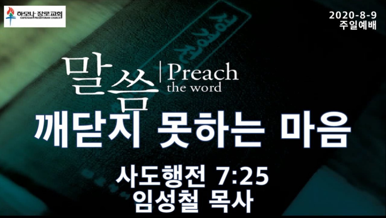 2020-8-9, 깨닫지 못하는 마음, 사도행전 7:25, 주일예배, 하모나장로교회, 임성철 목사
