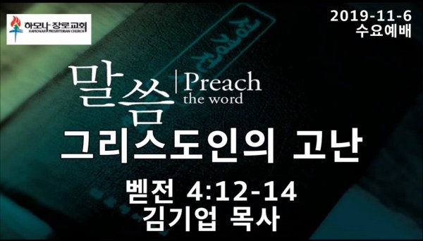 2019-11-6, 그리스도인의 고난, 벧전 4:12-14, 수요예배, 하모나장로교회, 김기업 목사