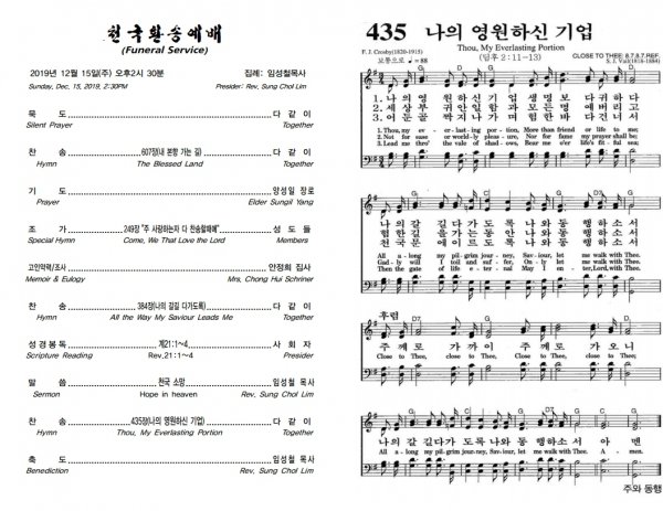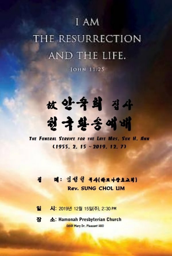 故 안숙희 집사 천국환송예배가 오는 주일 (12/15) 오후2:30에 하모나장로교회에서 있습니다. (1)