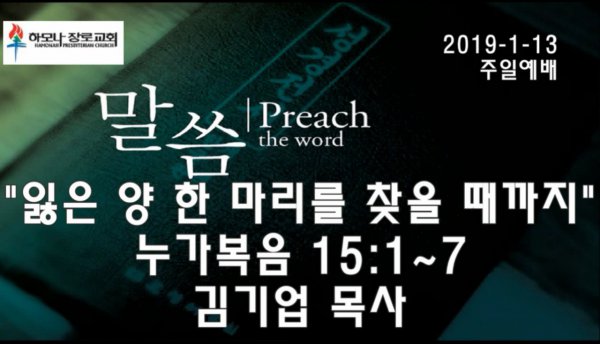 2019-1-13, "잃은 양 한 마리를 찾을 때까지", 누가복음 15:1~7, 주일예배, 하모나장로교회, 김기업 목사