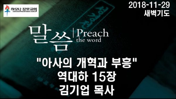 2018-11-29, "아사의 개혁과 부흥", 역대하 15장, 새벽기도, 하모나장로교회, 김기업 목사