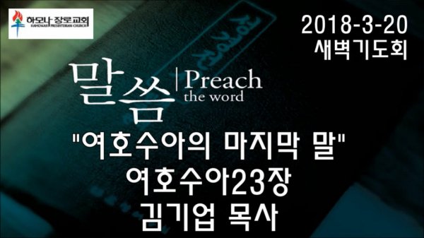 2018-3-20, "여호수아의 마지막 말", 여호수아23장, 새벽기도회, 하모나장로교회, 김기업 목사