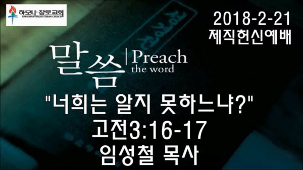 2018-2-21, "너희는 알지 못하느냐?", 고전3:16-17, 제직헌신예배, 하모나장로교회, 임성철 목사