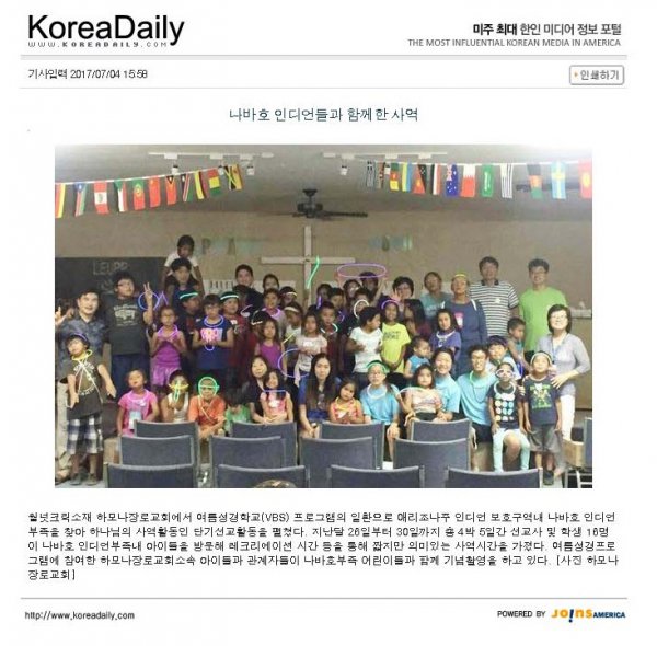 <중앙일보> 나바호 인디언들과 함께한 사역 & <한국일보> 하모나장로교회 나바호 인디언 단기선교