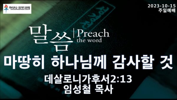 2023-10-15 마땅히 하나님께 감사할 것, 데살로니가후서2:13, 주일예배, 하모나장로교회, 임성철 목사