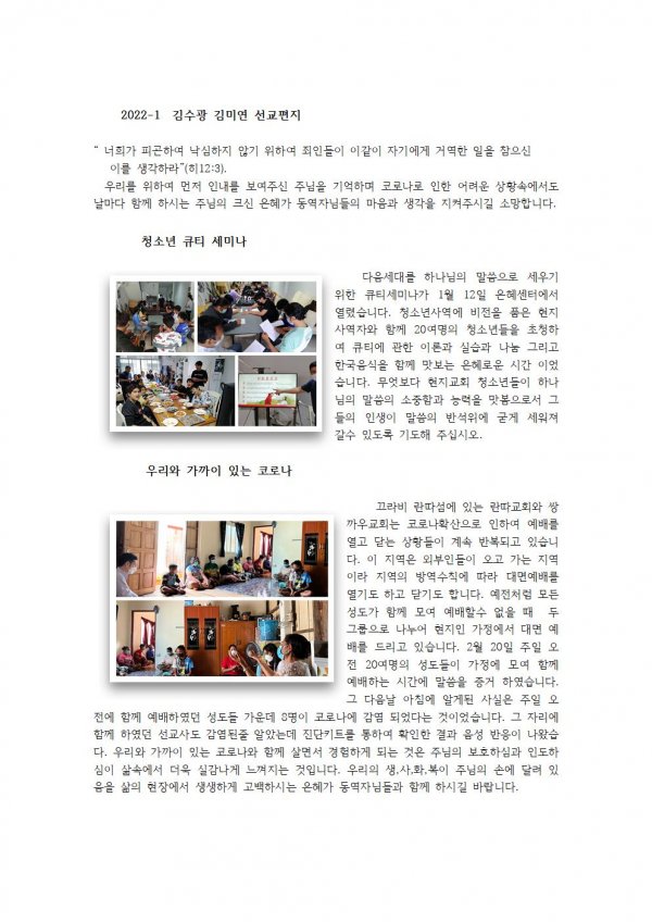 김수광, 김미연 선교사 2022년 3월 편지