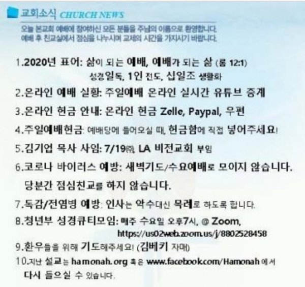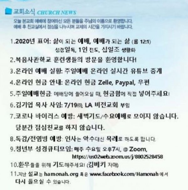 날짜: 2020.07.12 글쓴이 : 관리자 | 교회소식 News
