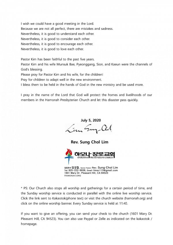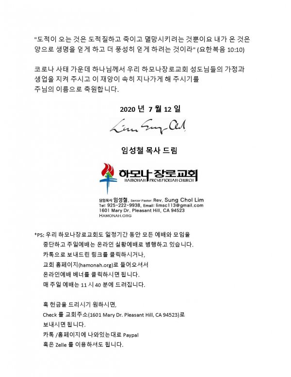 2020-7-12 하모나장로교회 주일예배 실시간 온라인 실황
